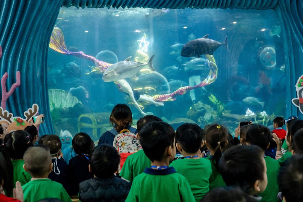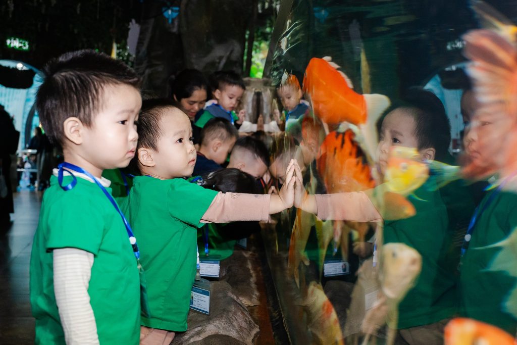 As they entered the exhibition areas, the children were amazed by the vibrant colors of the freshwater fish, then filled with curiosity when discovering the mysterious “residents” of the reptile cave. In the saltwater zone, the soft blue light made them feel as if they were strolling through the heart of the ocean.