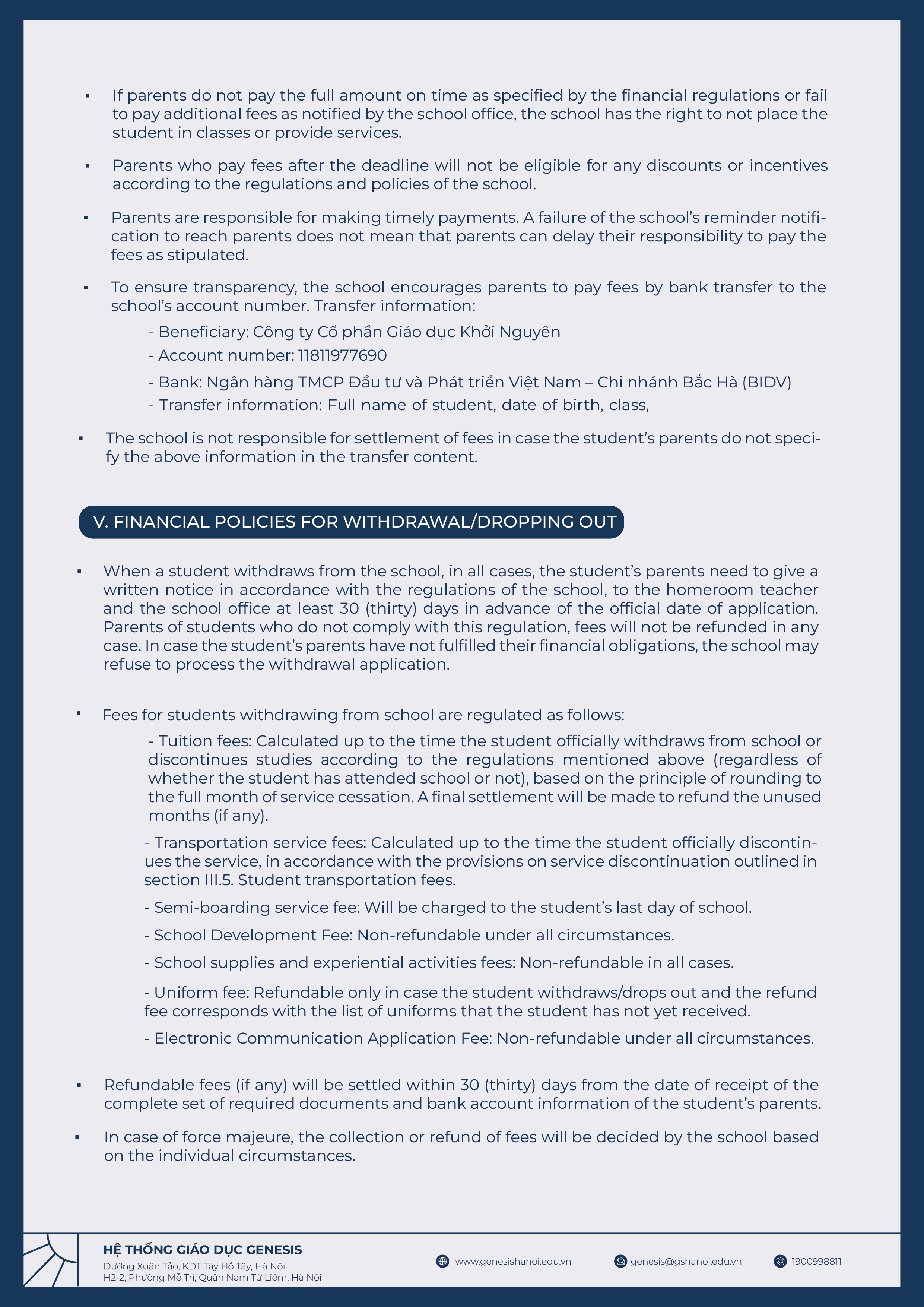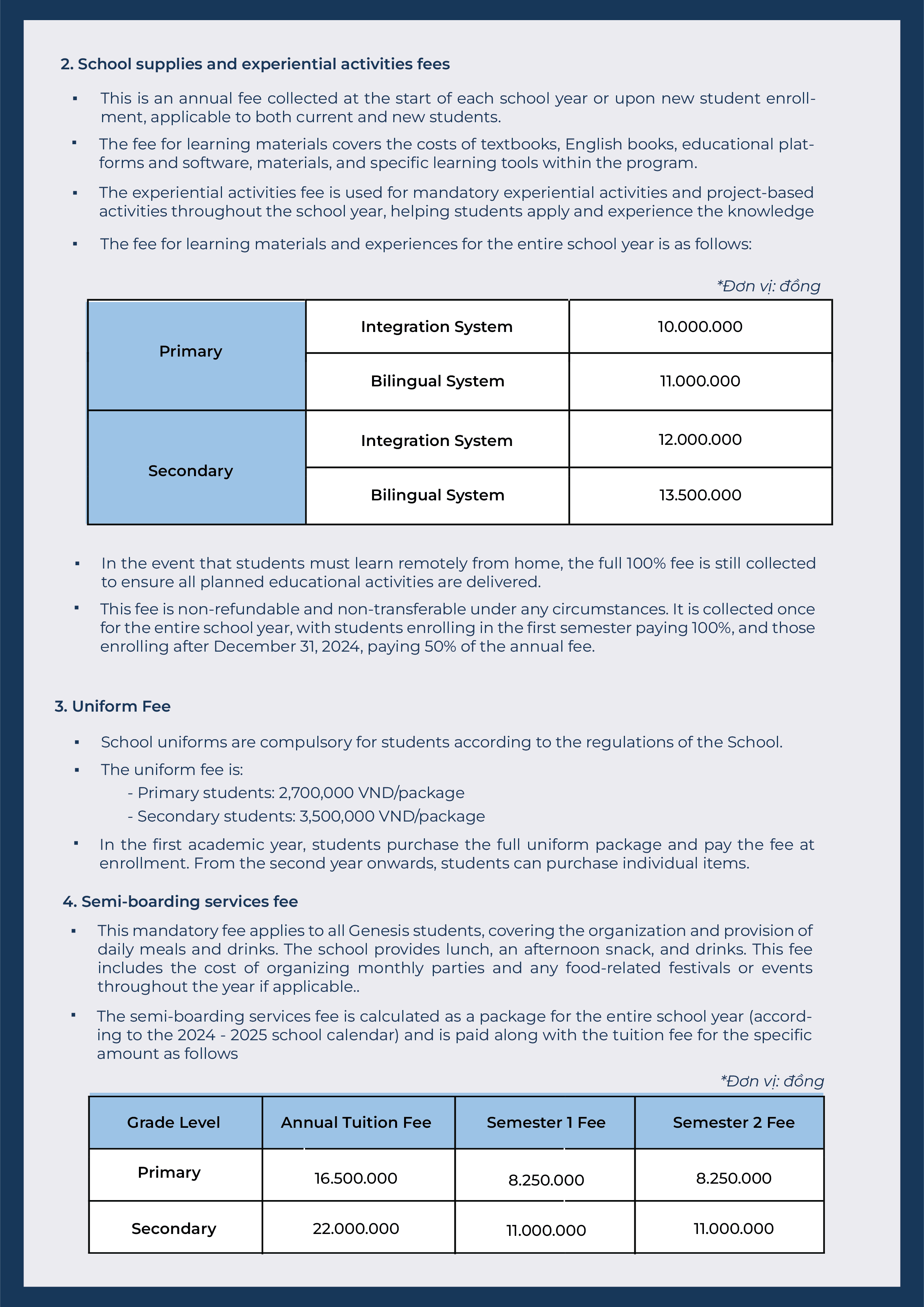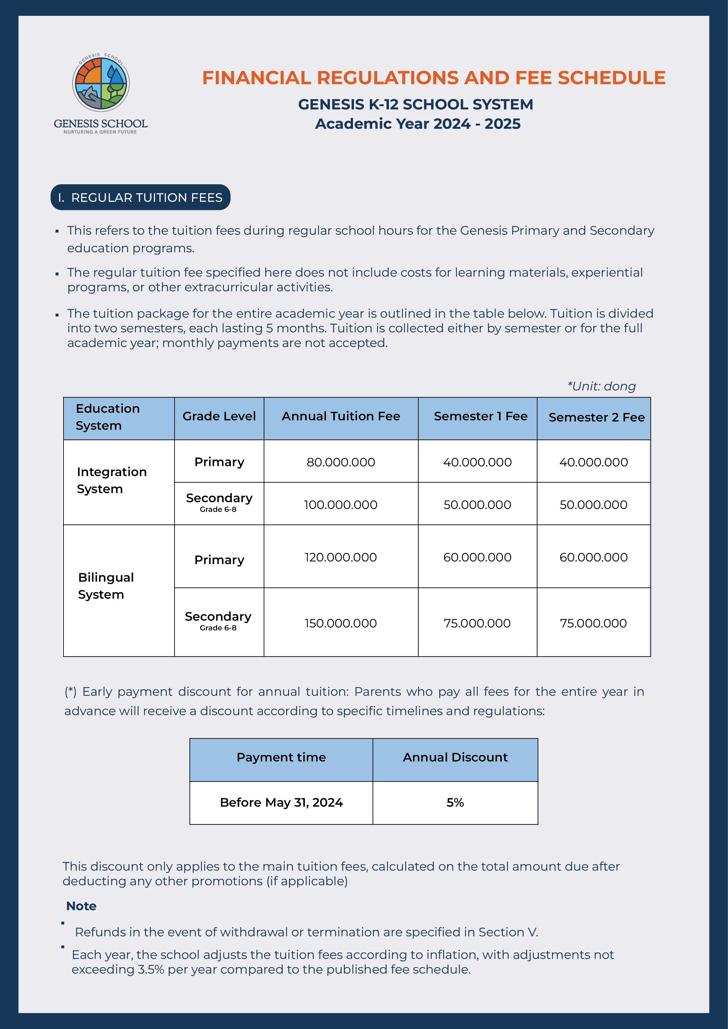 Financial regulations and fee schedule Genesis K-12 school system Academic Year 2024 – 2025 30/09/2024 Biên tập: Ban Biên tập Financial regulations and fee schedule Genesis kindergarten Academic Year 2024 – 2025 Explore the loving home through “A friend’s house visit” with Genee