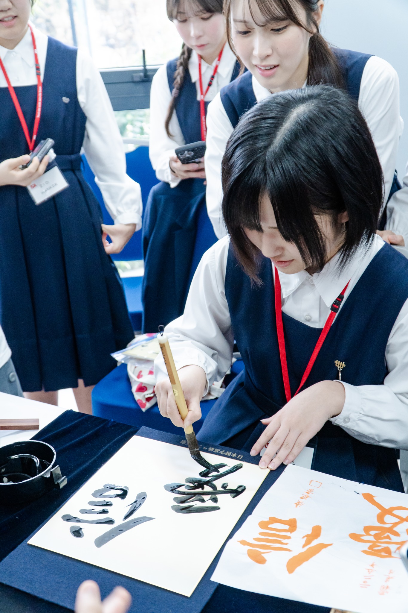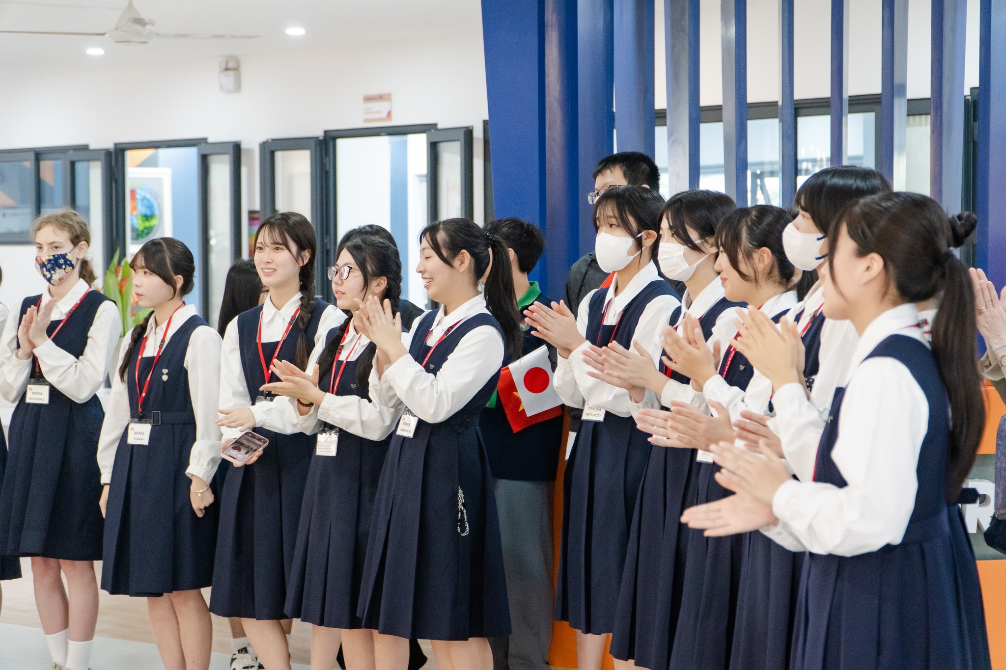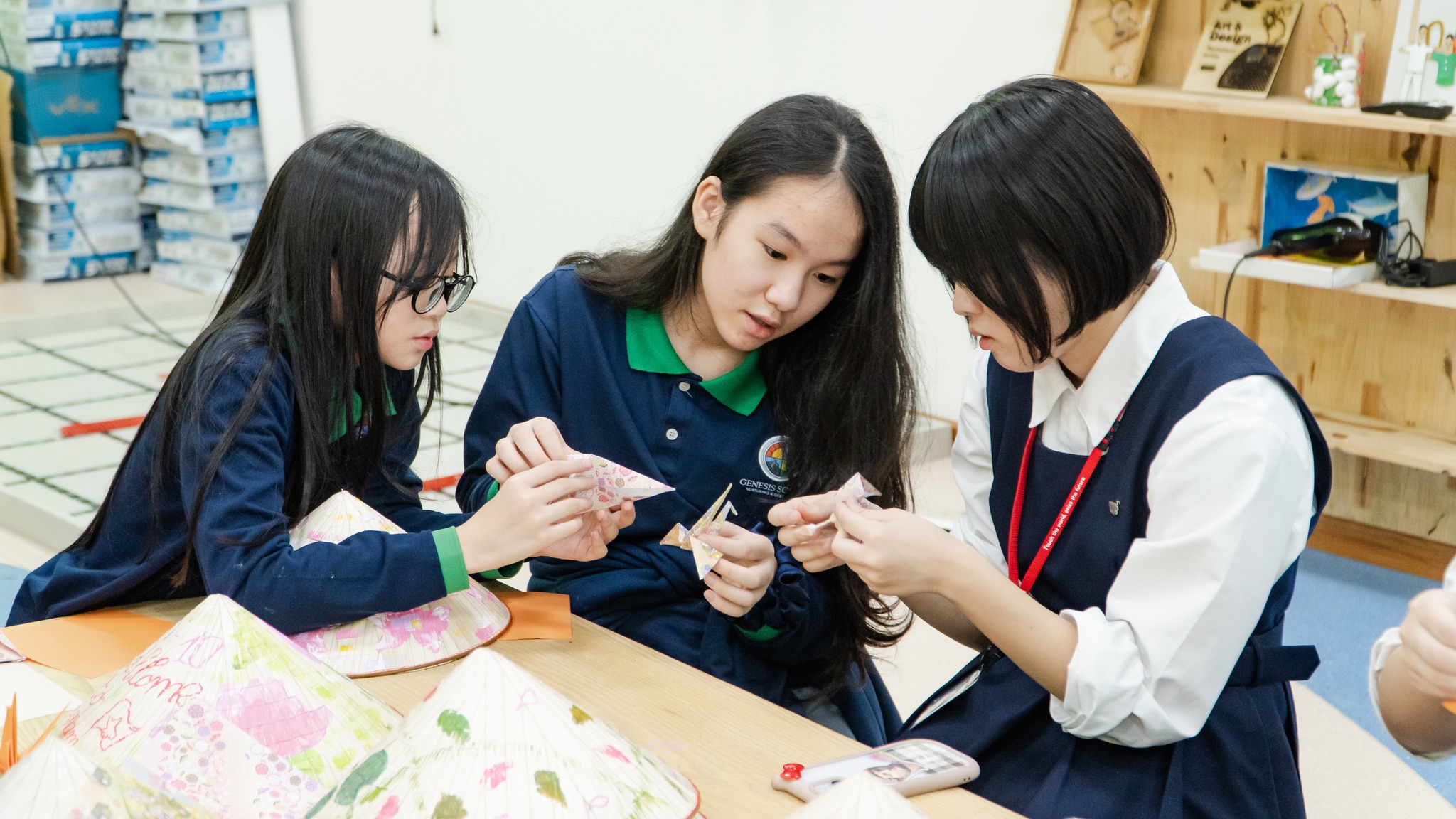 The moment barriers truly disappeared was when everyone joined the bamboo dance. From that point on, cultural activities unfolded effortlessly: the Junshin delegation introduced calligraphy, choral singing, and a short skit, while Genesis students guided their Japanese friends through decorating Vietnamese conical hats. Even familiar origami felt renewed within this atmosphere of cultural exchange.