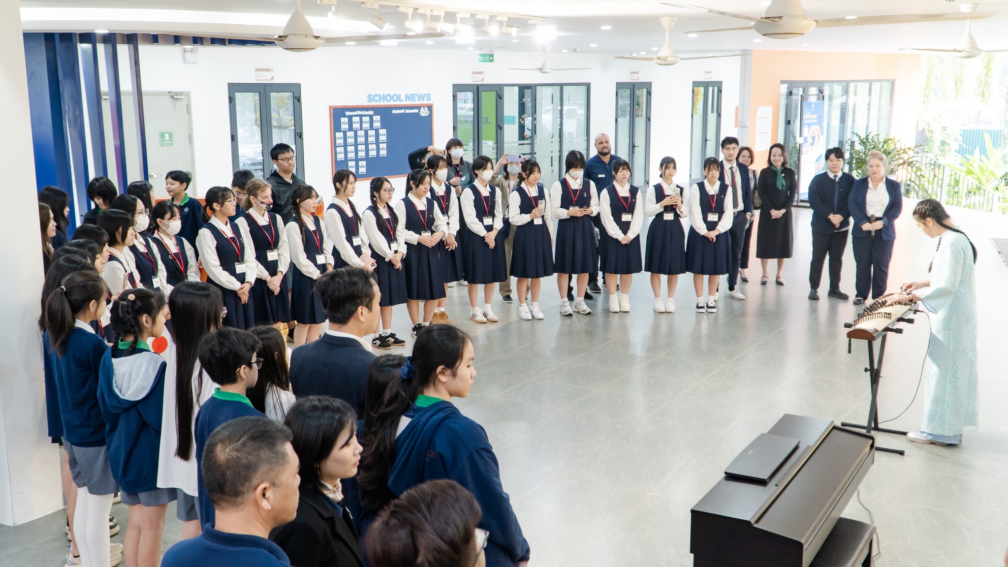 The sound of Nguyệt Lâm’s đàn tranh performance served as a graceful welcome, setting the tone for a day grounded in mutual respect for each other’s cultures. During the school tour with Mr. Charlie, students from both schools quickly moved past the initial hesitance and engaged in genuine conversations: learning habits, personal interests, and the similarities and differences between the two educational environments.