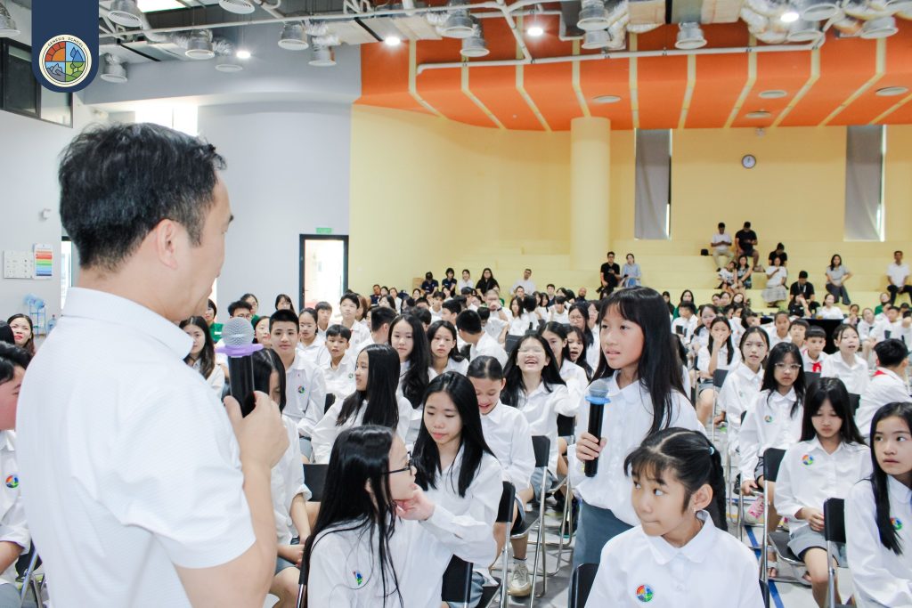 Trong không gian quen thuộc của Nhà đa năng, thầy Phan Anh cùng các Genee chia sẻ định nghĩa riêng về chủ đề năm học “Tự tin bứt phá”. Tiếng hô slogan của từng lớp vang vọng, khẳng định cá tính và quyết tâm của mỗi tập thể ngay từ ngày đầu tiên.