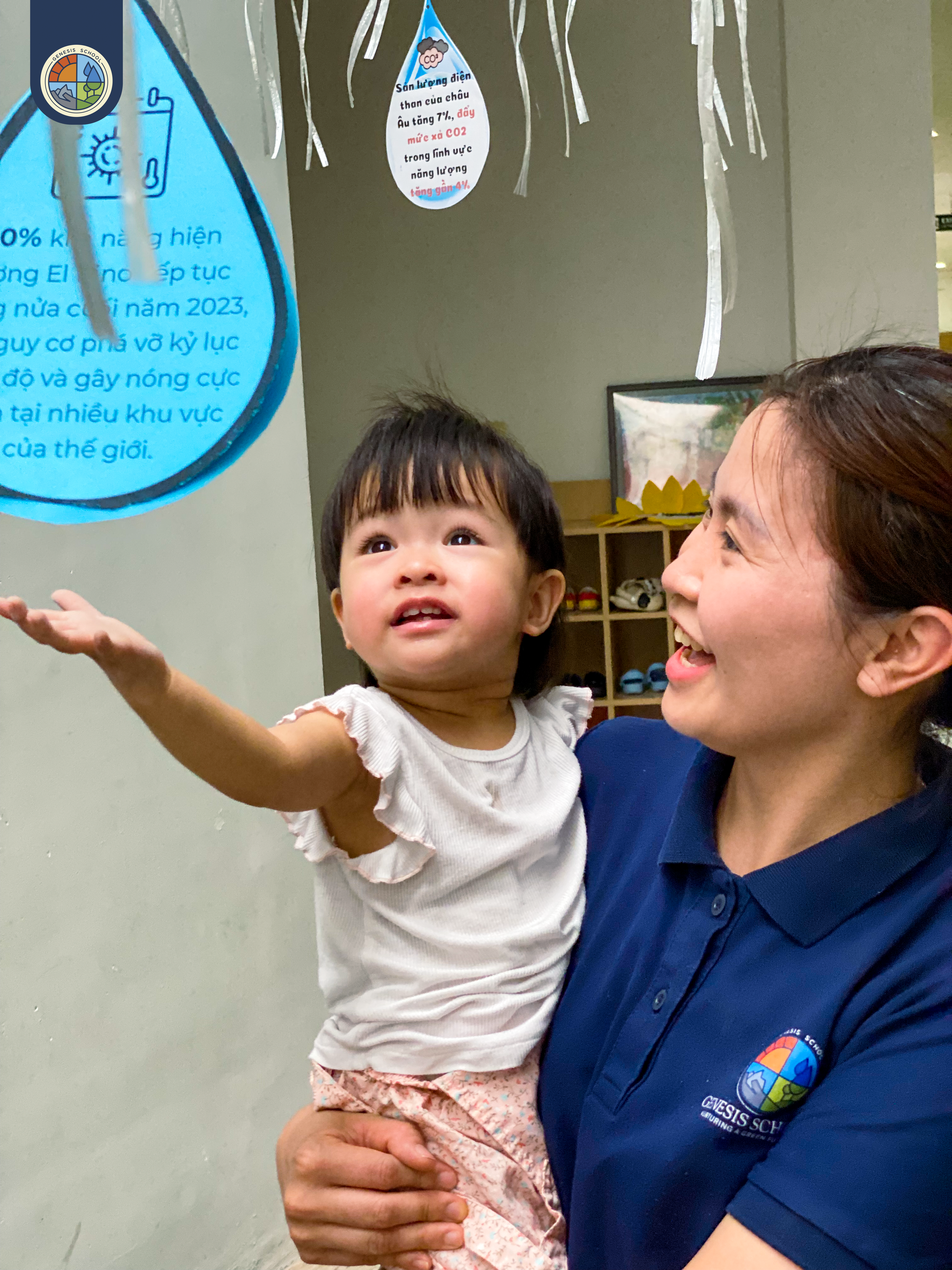 Tại lớp Oxy S2, các Genee được phát triển khả năng nhận biết tập nói thông qua các hoạt động đa dạng với chủ đề “Thời tiết”: nhìn hình ảnh trực quan của sự vật, hiện tượng mưa, nắng; cảm nhận về mặt xúc giác khi vui chơi tại không gian ngoài trời; lắng nghe âm thanh rì rào mô phỏng tiếng mưa… Không dừng lại ở việc nhận biết các hiện tượng tự nhiên như mưa, nắng, mặt trời, đám mây, các bạn nhỏ còn được mở rộng thêm vốn từ vựng của mình với các đồ dùng cần thiết sử dụng khi trời nắng như kính râm, chiếc mũ hay ô dùng khi trời mưa.