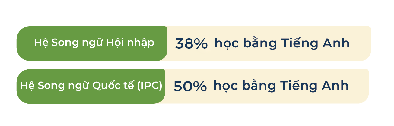- Song ngữ Quốc tế và Song ngữ Hội nhập. Mỗi chương trình được thiết kế riêng, mở ra hành trình học tập toàn diện, giúp học sinh vững kiến thức, giỏi kỹ năng và tự tin trong môi trường quốc tế.