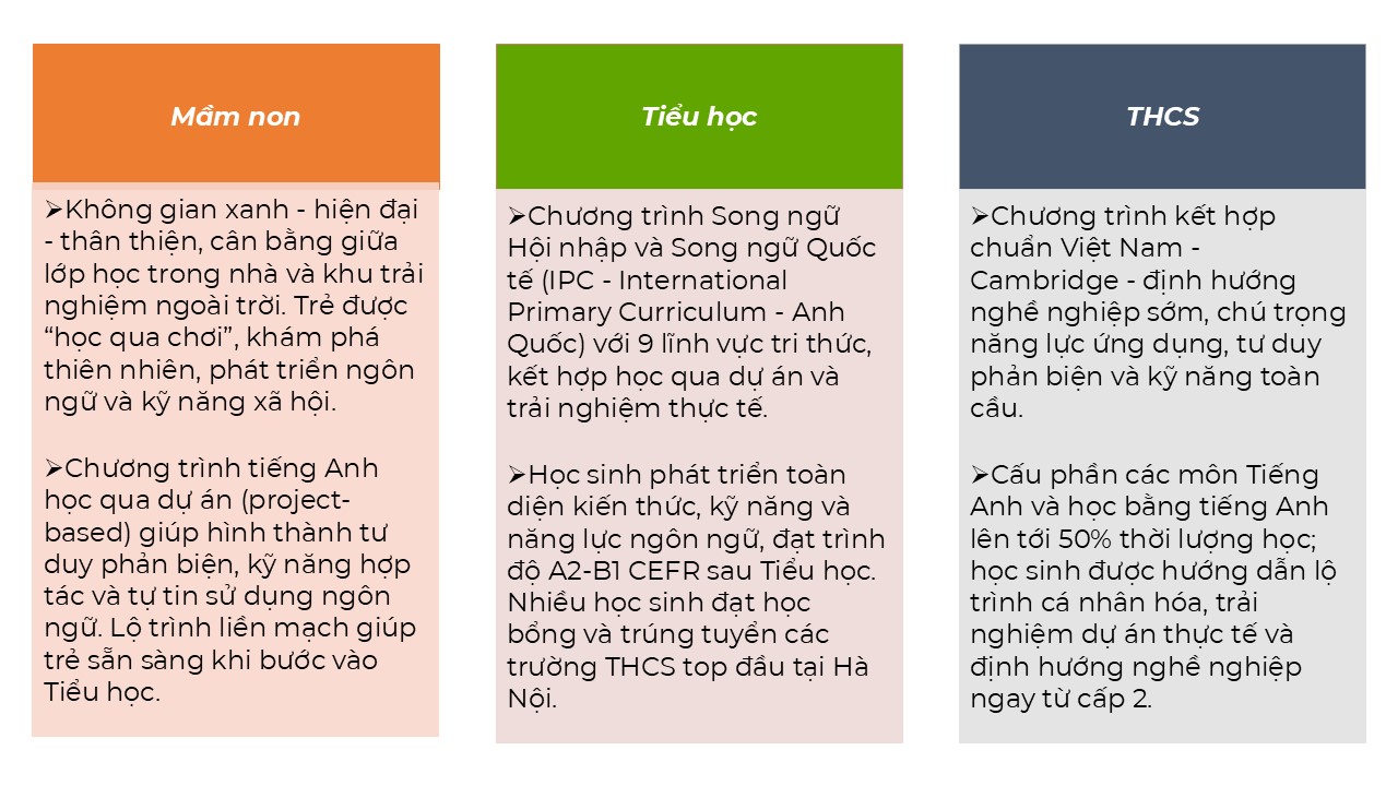 Học sinh được khuyến khích tư duy phản biện, sáng tạo, hợp tác và sử dụng tiếng Anh linh hoạt trong nhiều ngữ cảnh. Đội ngũ giáo viên tận tâm và giàu chuyên môn giúp mỗi học sinh phát huy tối đa tiềm năng, hình thành tình yêu học tập suốt đời.